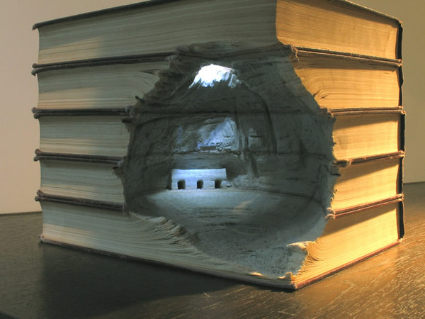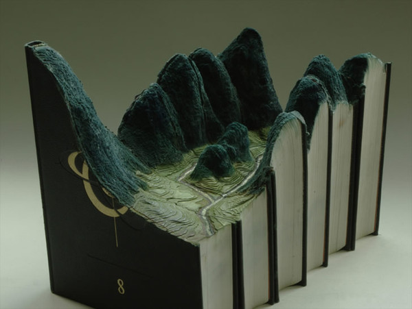 So I carve landscapes out of books and I paint Romantic landscapes. Mountains of disused knowledge return to what they really are: mountains. They erode a bit more and they become hills. Then they flatten and become fields where apparently nothing is happening. Piles of obsolete encyclopedias return to that which does not need to say anything, that which simply IS. Fogs and clouds erase everything we know, everything we think we are."